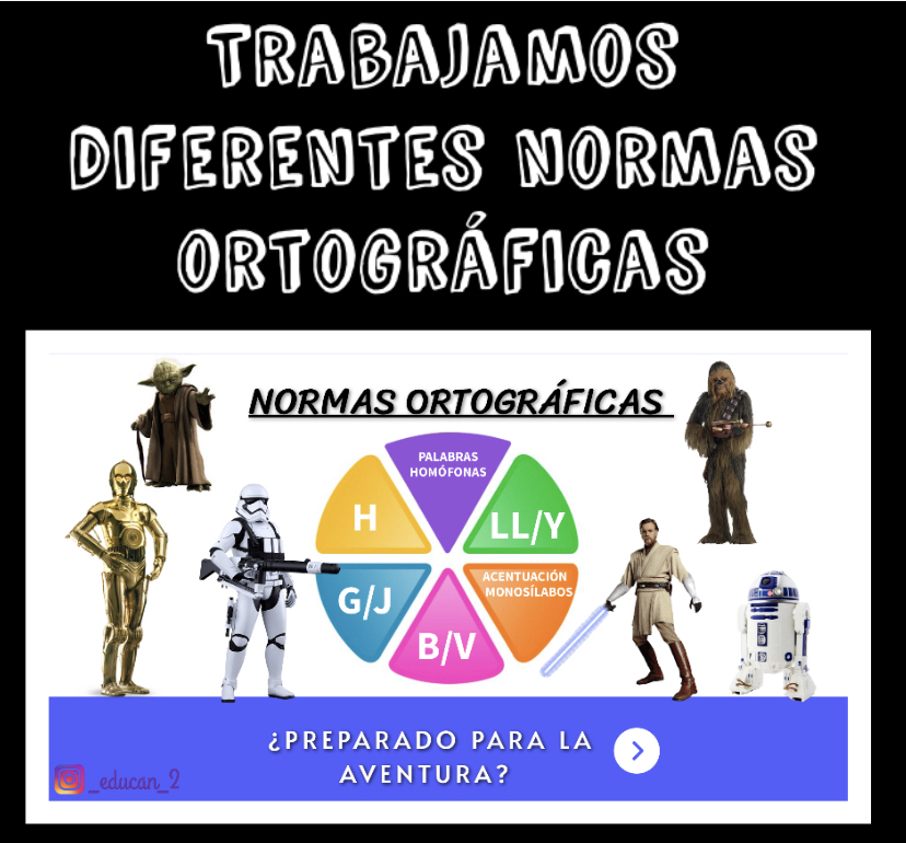 Los personajes irán mostrando las diferentes normas ortográficas acompañadas de vídeos explicativos para completar la información. Después tendrán que responder a las preguntas del color del quesito elegido y por último realizar una ficha interactiva de liveworksheets para asimilar mejor la norma ortográfica. Si realizan todos los pasos de manera correcta lo diferentes personajes irán entregando los quesitos de colores hasta conseguirlos todos y vencer al lado oscuro 😄.